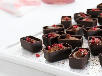 - Pour into the chocolate petit four cases and allow to set in the fridge. Once set, dust well with cocoa powder and garnish with a sprinkling of freeze dried raspberries.