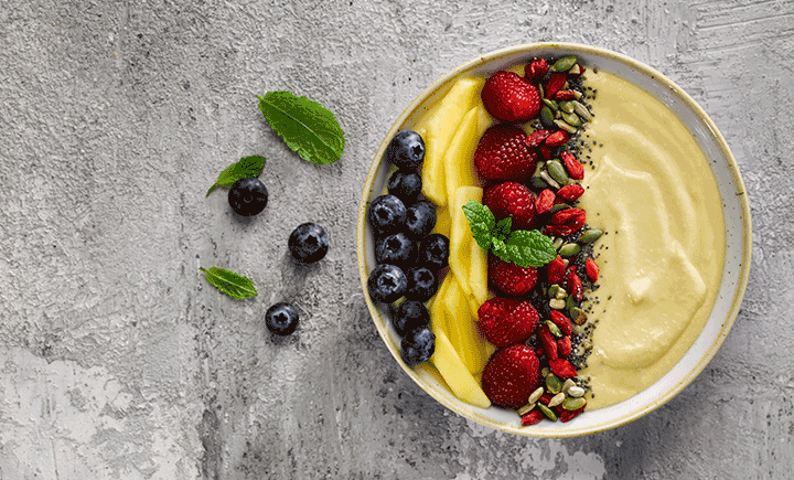- To assemble place the smoothie mix into your desired container then top with diced mango, raspberries, blueberries, fresh mint and seed mix.