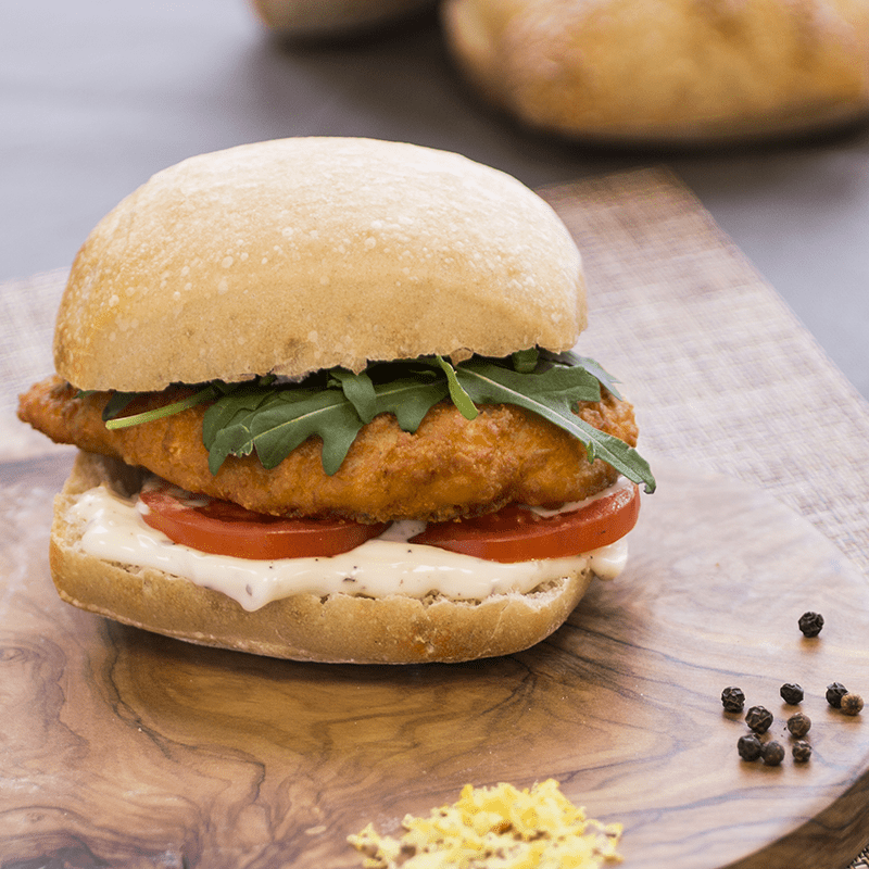 - Spread some of the mayo onto the bottom halves of the buns, top with a crispy battered chicken fillet and salad of your choice and serve.