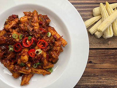 - Dip the dusted baby sweetcorn cobs in the batter and then deep fry in hot vegetable oil @ 190°c until crispy, golden and cooked through.