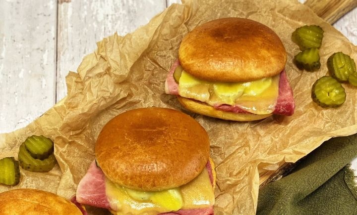 - Place the ham, cheese and sliced gherkins on one side of the bun.