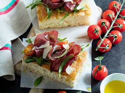 - Drizzle some extra virgin olive oil onto the base of the focaccia.