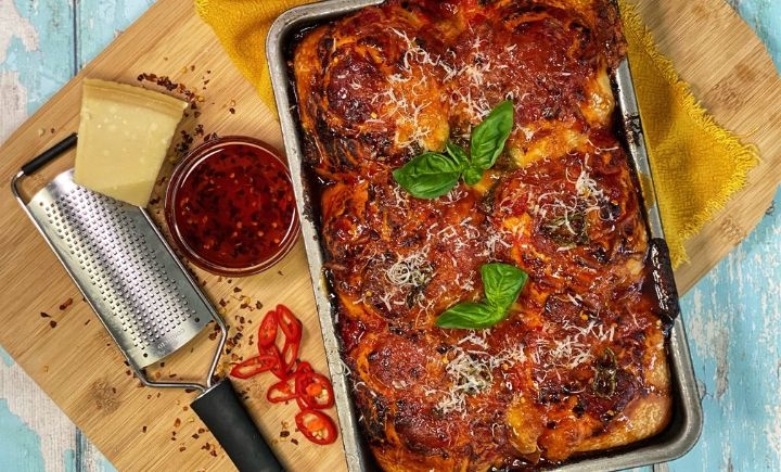 - Top the dough with tomato sauce, cheese, pepperoni, and a few chilli flakes and allow this to rest for 20 minutes before baking.