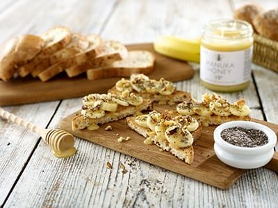 - Thinly slice the bananas and lay the slices on the toast to cover the top, drizzle with the lemon juice.