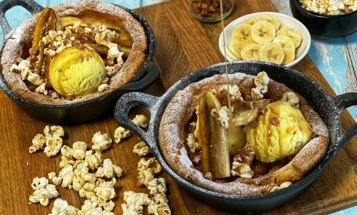 - Top each skillet with two scoops of ice cream, the glazed banana, a sprinkle of caramel cubes and a drizzle of caramel sauce. Finally, finish by scattering a handful of popcorn over the top and dust them with icing sugar