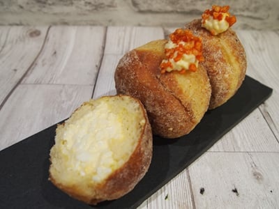 - Fill a piping bag with the egg mayonnaise and pipe into the doughnut - aim to get 30g.