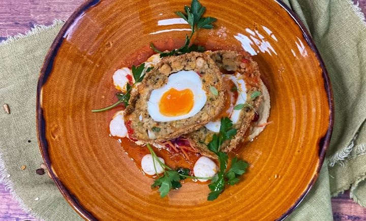 - Divide the mixture into 8. Take a portion at a time and flatten between your hands. (Rub your hands with a little more oil if it’s sticking to your fingers too much). Roll 1 of the peeled eggs in a little flour, and shake it off to remove excess. Then wrap the falafel mixture around it, moulding it to completely cover the egg and squishing it together gently so that it seals.