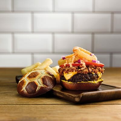 - Season & chargrill the burger until the centre reaches 75oC, allow to rest, heat the pulled pork topper to 75oC.
