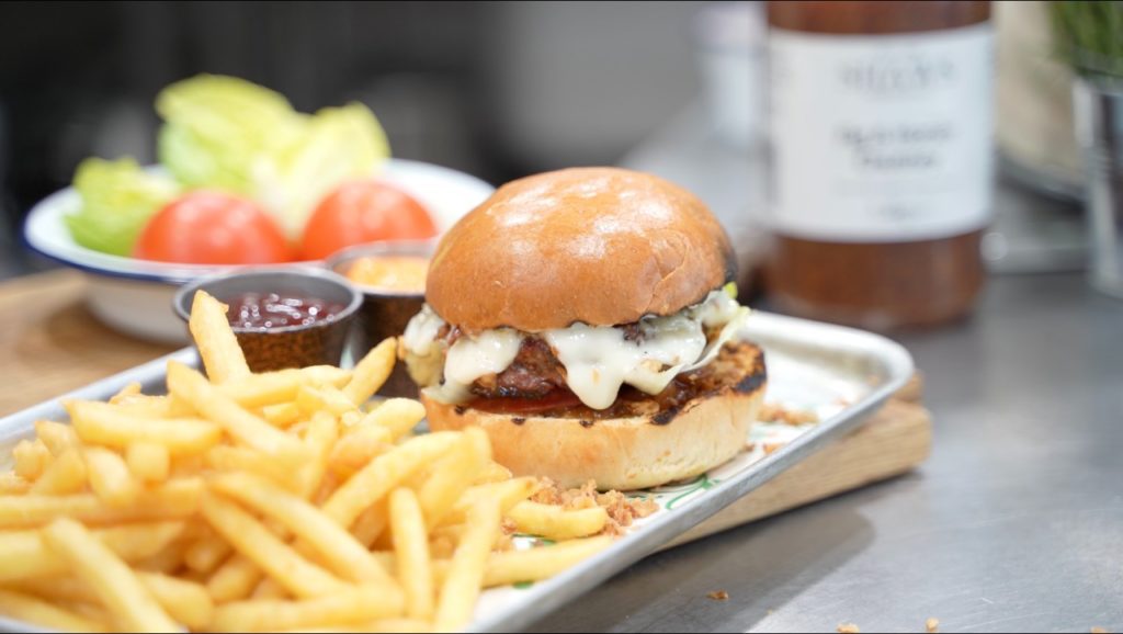 - Place the Farmstead bistro burger onto the grill and cook for 3-4 minutes on each side then top with crumbled blue cheese.
