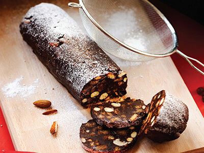 - In a large bowl, break the McVitie's Digestives© with your hands into medium-sized pieces. Add the almonds, butter, cocoa powder, the remaining cognac and the condensed milk. Add the raisins and mix in thoroughly. It will form a very dense mixture so it may be easiest to mix it with your hands.