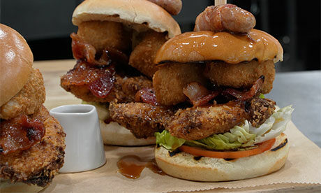 - Assemble the burger and tip with a pig in blanket and then drizzle with gravy