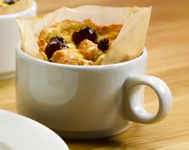 - Divide half the bread between the mugs evenly, then top with the choc chips and cherries as desired, and repeat the process for 4 cups.