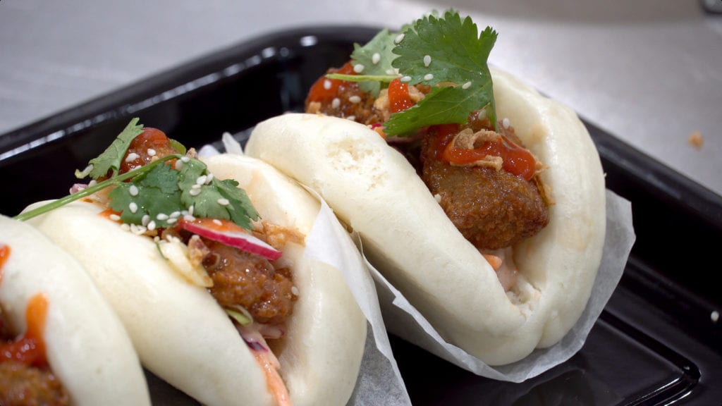 - Once the bao buns are hot fill with the slaw, coated chyck'n and drizzle with more sriracha, sliced radish, coriander, toasted sesame seeds and sliced spring onions