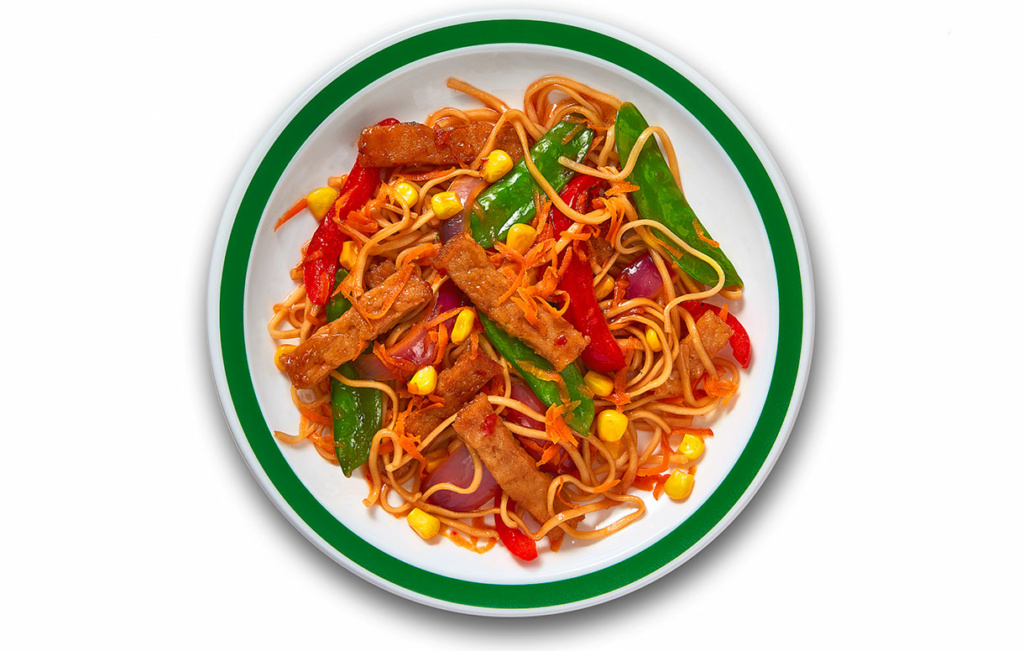 - Heat the oil in a large wok. Add the frozen Fry’s Chicken-Style Strips or chunks and stir fry for 5 minutes, then add the onion and garlic, continuously stirring for a further 3 minutes.