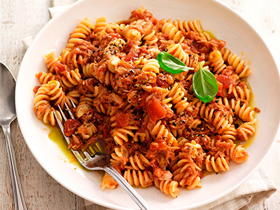 - Flake the tuna into the tomato sauce with the lemon zest and bring back up to the boil. Drain the pasta and stir in the tuna sauce. Serve with fresh basil.