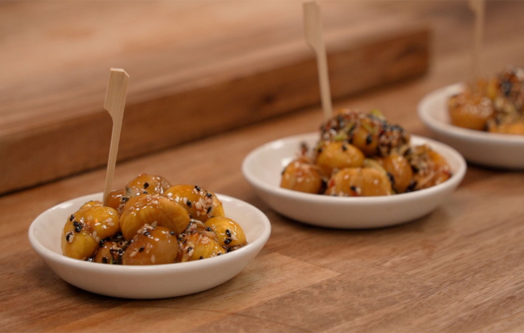 - Defrost the chestnuts and pan fry with a little water for 2-3 minutes, then add the sauces, sesame seeds and honey and cook until glazed