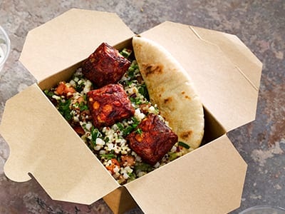 - Dice the tomato, cucumber and red onion, slice the baby spinach and mix this with the grains.