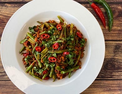 - Heat a wide based frying pan and place on a high heat. Add the sliced green beans and fry over a high heat for 7-8 minutes until starting to blister. Set aside.