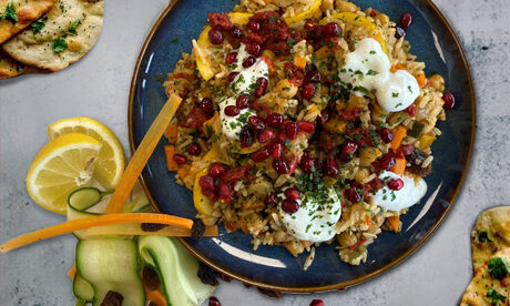 - Transfer to a serving dish, scatter over pomegranate seeds, add dollop of Greek yoghurt and drizzle over the harissa paste