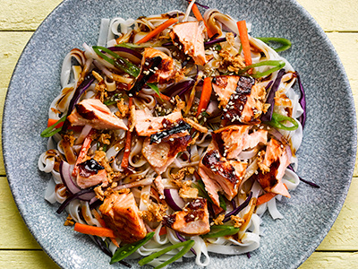 - Toss the dressing with the noodles and serve into bowls, then top with the salmon, sesame seeds and crispy onions.