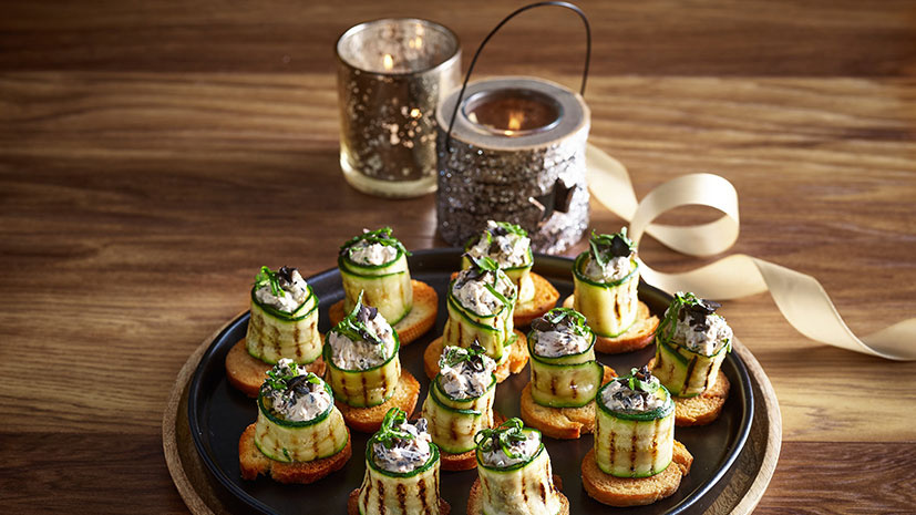 - Evenly divide and place the cheese mix at the end of each of the courgette strip, then gently roll the strip around the cheese to form a cannelloni style shape. This can be secured with a cocktail stick as a canape or left as is if serving with a fork.
