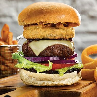 - Top with the burger, cheese slice & deep fried haggis fritter.