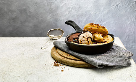 - Top the cooked cookie dough with the ice cream and drizzle with chocolate sauce and flake pieces