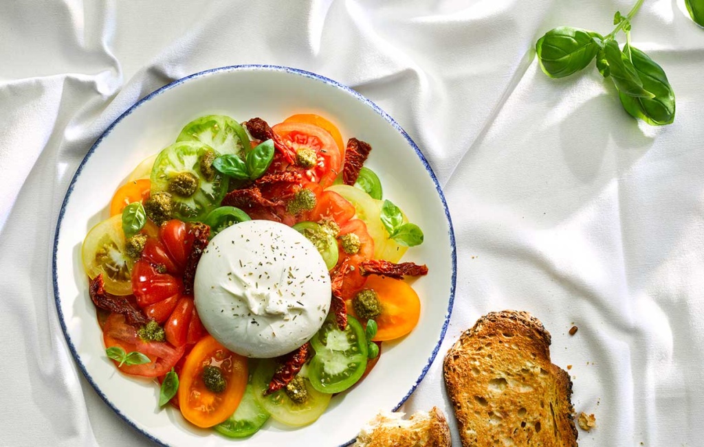 - Place the burrata in the centre and drizzle with pesto and fresh basil