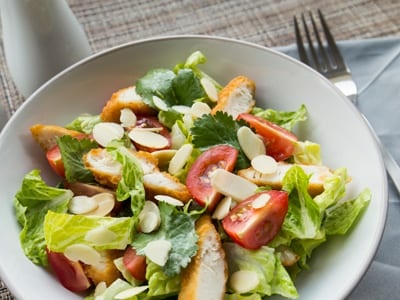 - To assemble the salad, add the chopped romaine greens, the cherry tomatoes, the sliced almonds, and the coriander to a large bowl, and drizzle in some of the dressing; toss to evenly coat, then divide equally among 4 plates, and top with some of the crispy chicken, drizzled with a little extra dressing, if desired.