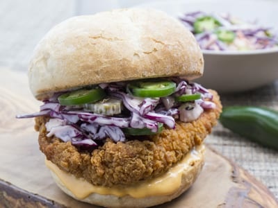 - Build: spread each side of the toasted rolls with spicy mayo. Add the spicy chicken fillet and top with jalapeño slaw.
