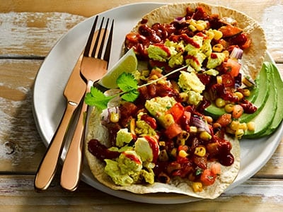 - Top with scrambled tofu, corn salsa, avocado slices, lime wedge and a drizzle of Mexican adobo sauce.