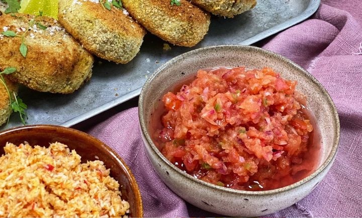 - Separately, place the chilli, chilli powder and onion into a food processor and pulse together until chopped. Add the skinned and de-seeded tomato and pulse together until it’s lightly broken down.