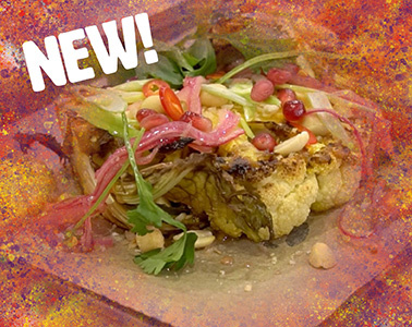 - Place the cauliflower steaks onto your chosen serving plate and top with pickled pink onions, dollops of the Keralan yoghurt, fresh coriander sprigs, pomegranate seeds, sliced spring onions and red chilli