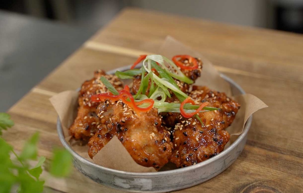 - Tumble the wings in the sauce and sesame seeds then top with red chilli and spring onions.