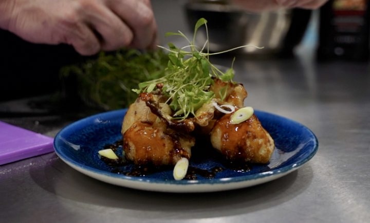 - Tumble the cooked cauliflower through the sauce and finish with micro coriander, sliced spring onions and wedges of fresh lime.