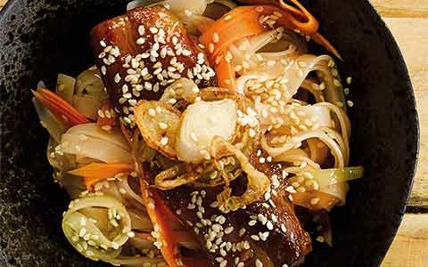 - Toss the dressing with the noodles and serve into bowls, then top with the slices of Korean pork, sesame seeds and crispy shallots