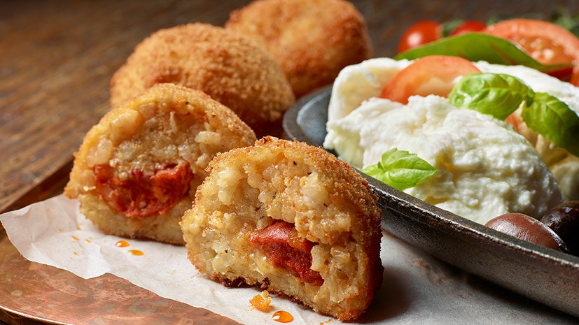 - Heat the oil in a deep fat fryer to 180°C. Deep fry the Arancini in batches, for approx. 5 minutes, or until golden brown and the centre is cooked. Drain on kitchen paper and serve immediately