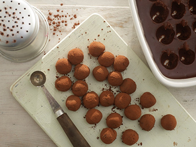 - Use a parisienne scoop to make the truffles or hand roll into balls before dusting with cocoa powder.