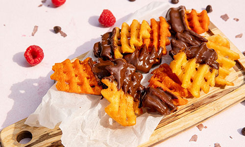 - Once they are slightly cooled, dip half the criss cuts into the smooth chocolate mix and leave to cool on a cooling tray or add additional toppings and allow to dry.