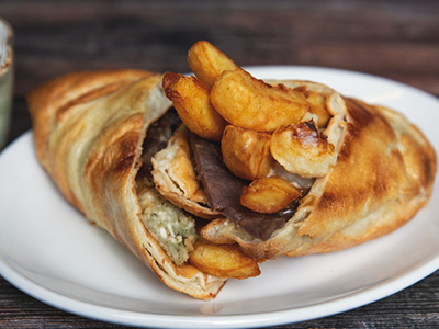 - To assemble, place the wrap on a plate. Top with the slices of beef, gravy and cauliflower cheese. Add the stuffing to one half of the pudding and the Dukes to the other half. Roll the pudding to wrap like a burrito and serve.