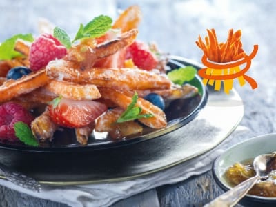 - Cut apple in very small cubes and stew slowly with sugar and cinnamon on a low heat. Gently flambe freshly cooked sweet potato crispy fries with icing sugar until you have an very thin crust that resembles a crème brulee.