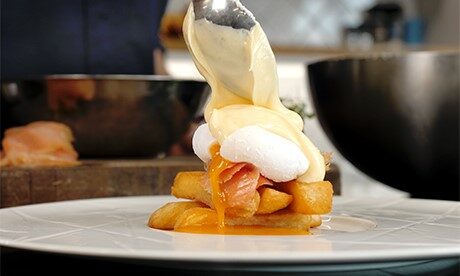 - Place smoked salmon on top, remove duck egg from hot water, serve with a dallop of warm hollandaise. Garnish with micro herb and serve. Voila! A brunch fit for a king… or a queen!