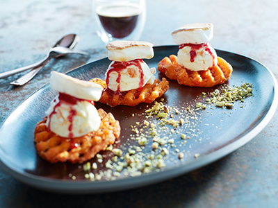 - Place a small ball of ice cream on to each CrissCut, drizzle with the cranberry syrup and top with a half of marshmallow. Toast lightly with a blow torch just before serving.
