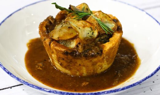 - Fill the pie tins, pre-lined with the pastry, top with sliced blanched potatoes, brush with melted butter and cook for 30-35 minutes until the pastry is cooked and the potatoes are browned.