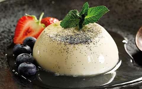 5. Serve the panna cotta with the syrup and some fresh berries & mint