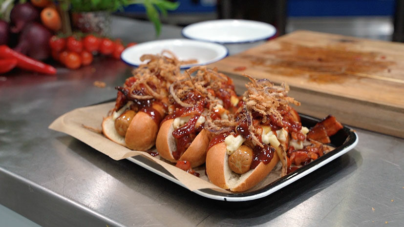 - Heat the butter and fry the bun, heat the hot dog and fill the top with all other ingredients, finish with crispy onions and the remainder of BBQ sauce.