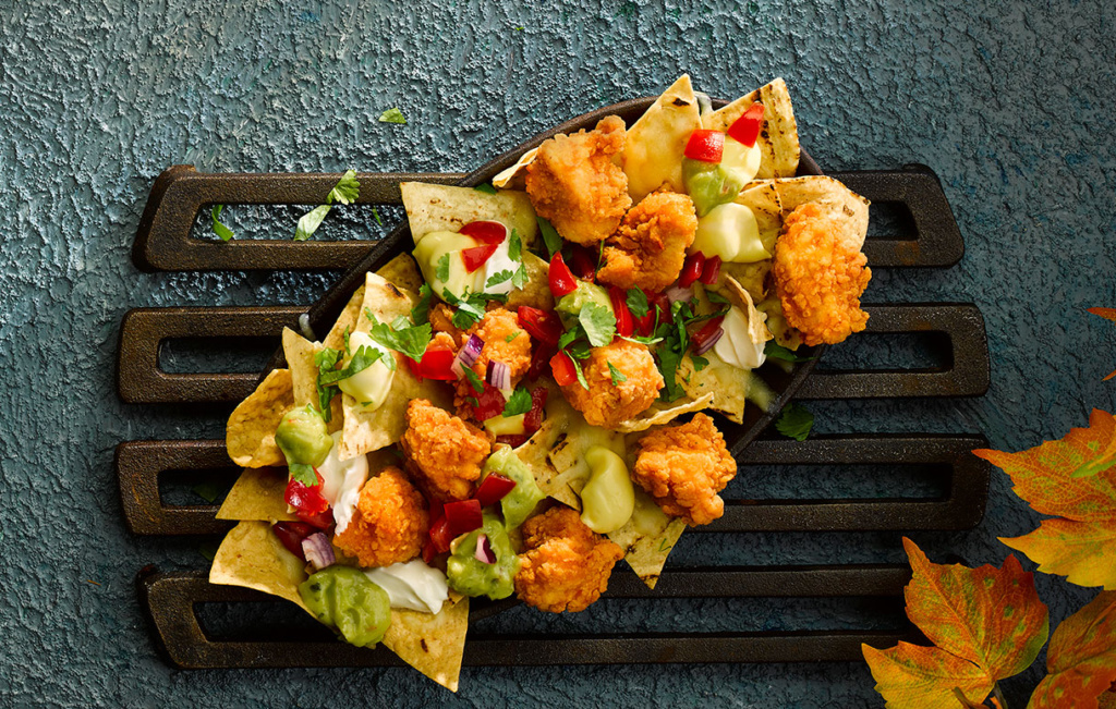- Top with the nachos sauce, popcorn chicken, guacamole, salsa, sour cream and micro coriander.