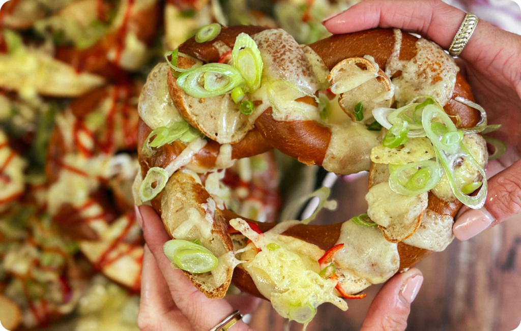 - Place the pretzels onto another baking tray and place the cheese, sausages, spring onion and red chilli onto the pretzels. Place into the oven until the cheese has melted.