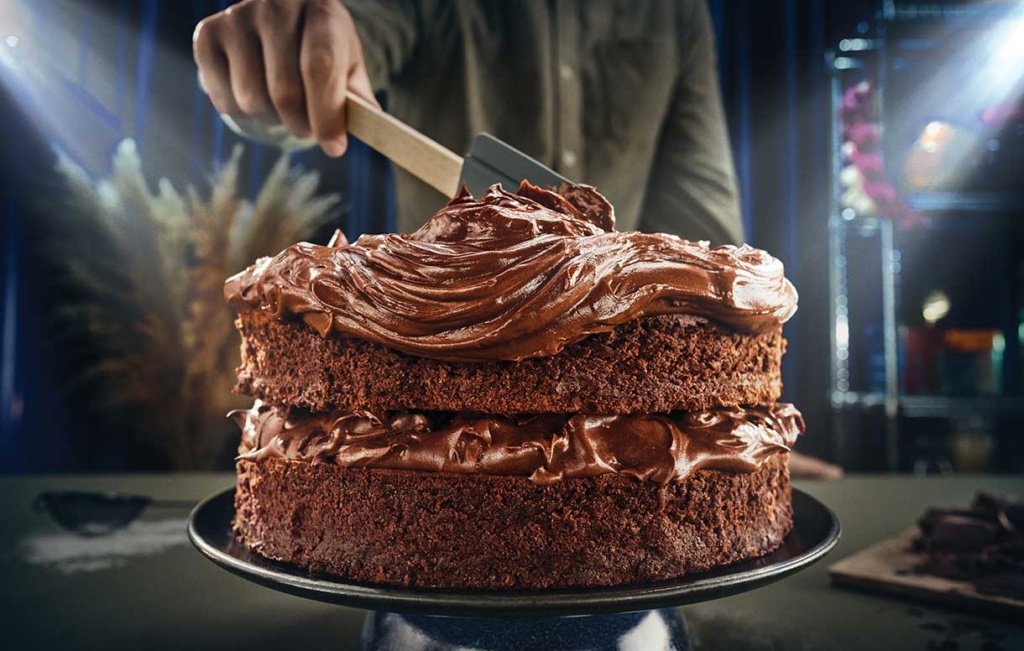 - Leave for about 45 minutes to 1 hour, whisking now and again — when you’re passing the mixing bowl — you are looking for a consistency that is soft but firm enough, so you can spread over the cake without it being too runny, then it is time to assemble the cake.