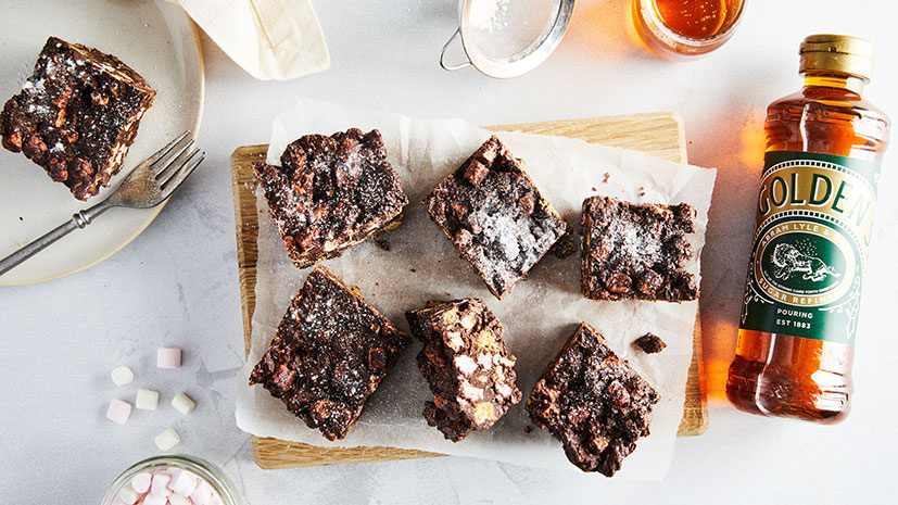 - First, line a shallow 20 cm/8-inch square tin with baking parchment. Then, in a small pan, heat the butter, plain chocolate, Lyle’s Golden Syrup, caster sugar, cocoa powder and stir together with a wooden spoon. Once melted together, leave to cool for 10 minutes. Alternatively, heat in the microwave for 2 minutes and stir until smooth.